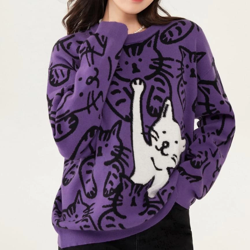 Le pull doux violet avec motifs adorables de chats est un vêtement à la fois confortable et élégant. Fabriqué à partir d’un mélange de coton et de polyester, il offre une texture douce et agréable au toucher, qui enveloppe le corps dans une sensation de chaleur et de confort. Le design du pull est orné de motifs de chats, qui ajoutent une touche de fantaisie et de charme à l’ensemble. Les chats sont représentés dans des poses différentes, avec des expressions faciales mignonnes et amusantes, ce qui donne au pull un aspect ludique et joyeux.